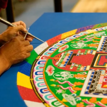 - Les mandalas de sable sont les plus emblématiques : minutieusement réalisés par des moines avec du sable coloré, ils sont ensuite détruits pour symboliser l’impermanence de toute chose.