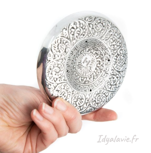 Porte-encens mixte pour cônes et bâtonnets fins en forme de coupelle plate finition argentée avec des décors d''arabesques.