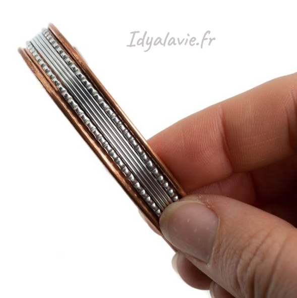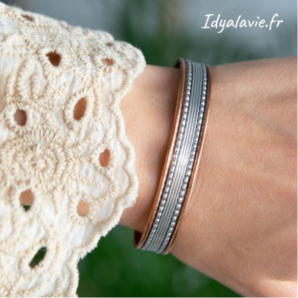 Le cuivre est apprécié pour ses vertus apaisantes: calme le stress, agit comme anti-inflammatoires pour soulager les articulations et contribue à une meilleure circulation sanguine en diminuant les gonflements.