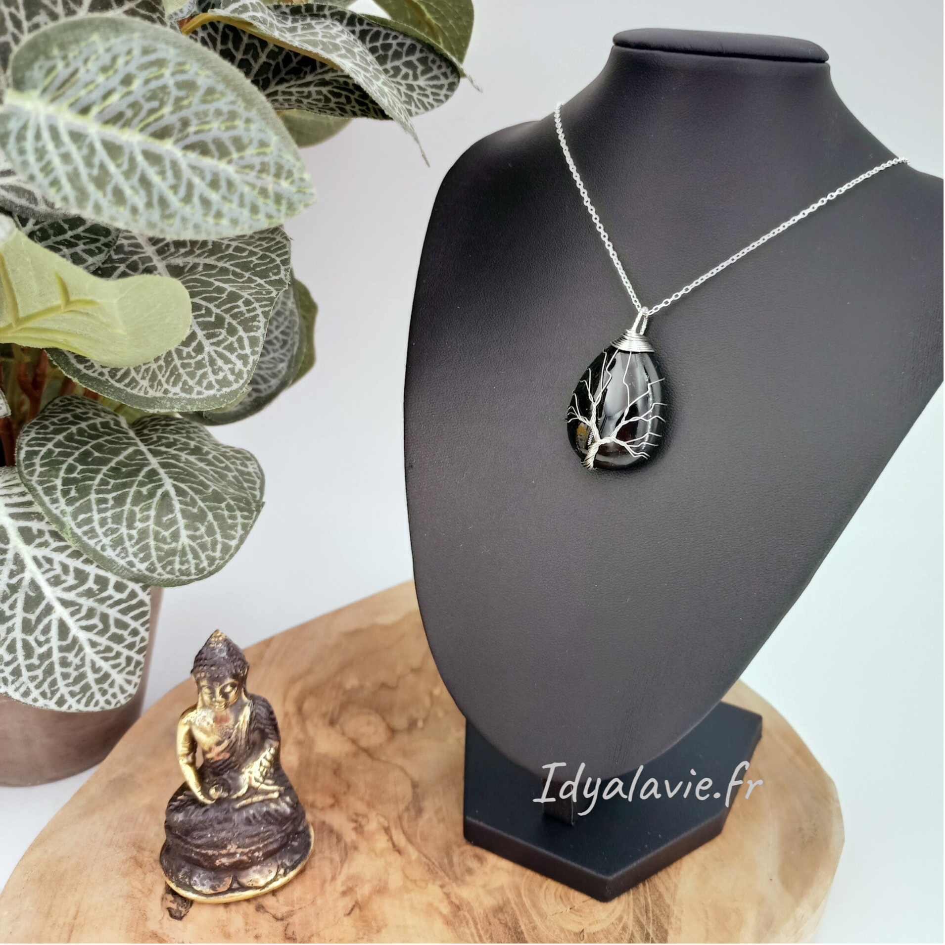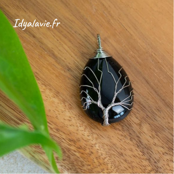 Pendentif en pierre naturelle d'Obsidienne entourée d'un motif en métal tourné finition argentée arbre de vie.