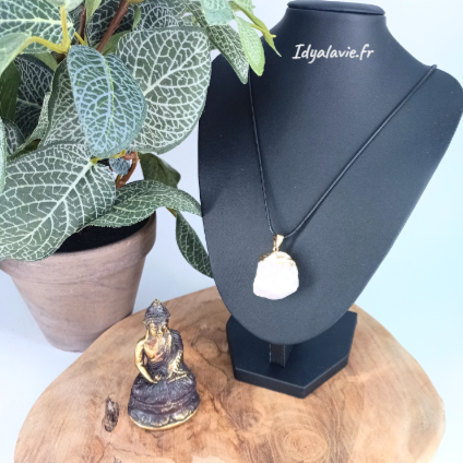 Pendentif en pierre naturelle brute de quartz rose montée sur sertissage métal finition dorée.