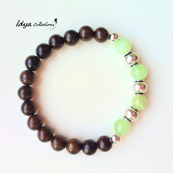 Une composition originale de Idya Créations pour ce bracelet extensible composé de pierres naturelles de Jadéite et bois d'ébène en perles de 8 mm. Apprêts métal finition argent.