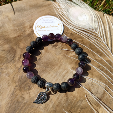 Bracelet Améthyste et Pierre de lave feuille argent