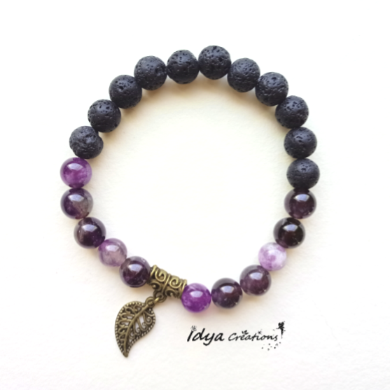 Bracelet Améthyste et Pierre de lave feuille bronze