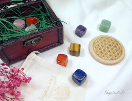 Dans ce joli petit coffre de type colonial de fabrication artisanale en bois, découvrez 8 pierres essentielles pour tout amateur de pierres qui souhaiterait commencer à s'initier à leurs vertus et s'entourer de leur belle présence.