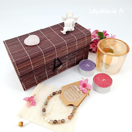 Proposée prête à offrir dans une boîte en lamelles de bambou écologique, faite main ainsi qu'un QR code permettant d'accéder à un descriptif détaillant le coffret, chaque pierre présente et leurs vertus ainsi que la manière de les entretenir.
