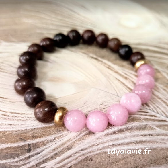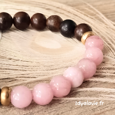Une composition originale de Idya Créations pour ce bracelet extensible composé de pierres naturelles de Kunzite et bois d'ébène en perles de 8 mm. Apprêts métal en laiton.