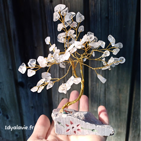 Ces arbres de pierres semi-précieuses sont fabriqués en Inde à la main à partir de véritables pierres de cristal de roche assemblées par une structure métallique souple dorée montée sur un support en pierre de stéatite décorée d'un motif végétal.