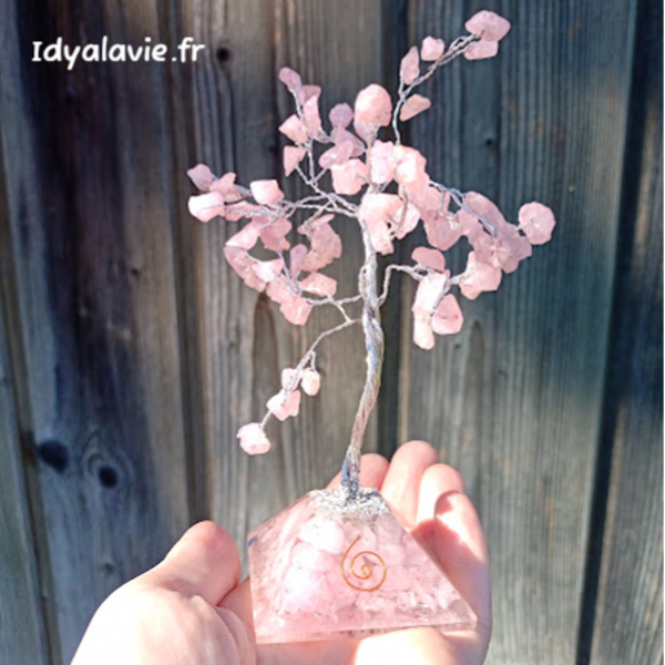 Ces arbres de pierres semi-précieuses sont fabriqués en Inde à la main à partir de véritables pierres de quartz rose assemblées par une structure métallique souple argentée montée sur une pyramide d'orgonite*