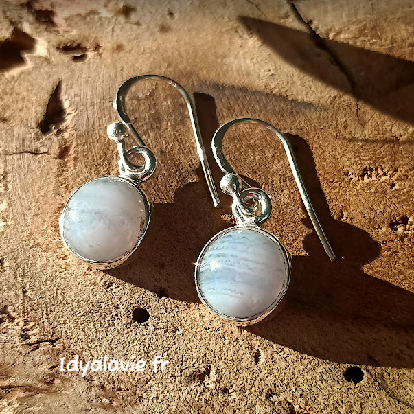 Boucles d'oreilles intemporelles et élégantes en pierres naturelles de calcédoine blue lace rondes montées sur base en argent 925.