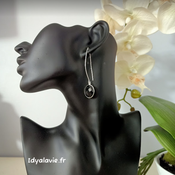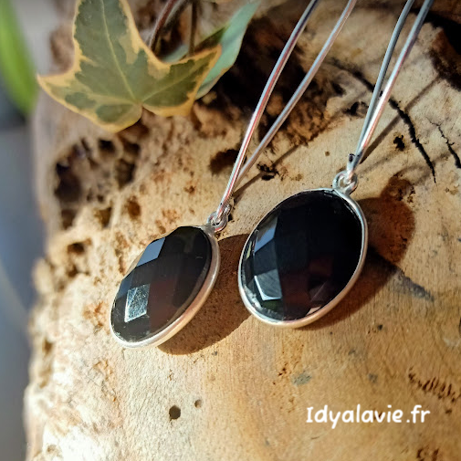 Boucles d'oreilles bohèmes artisanales en pierres naturelles d'Onyx de forme ovale, facettées et montées sur base en laiton finition argentée.