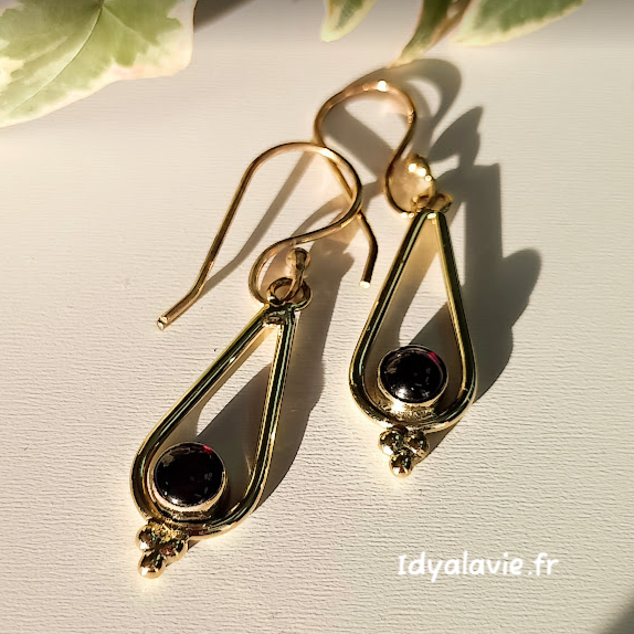 Boucles d'oreilles artisanales toute en légèreté en forme de goutte ajourée avec pierres naturelles de grenat rondes montées sur base laiton finition dorée.