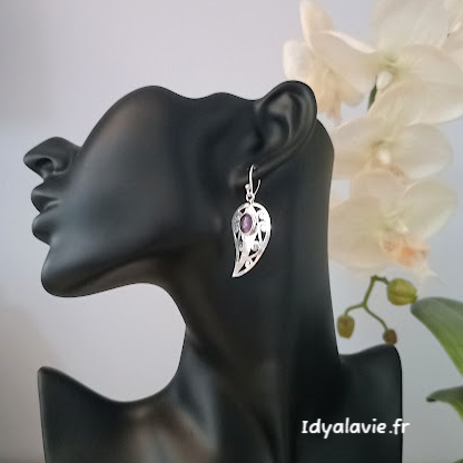 Boucles d'oreilles artisanales très élégantes reprenant le motif Cachemire avec pierres naturelles d'Améthyste rondes montées sur base laiton finition argentée.