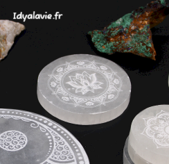 Petite plaque de rechargement gravée d'un décor de Lotus dans un mandala. Idéale pour recharger vos pierres et bijoux. Elle est également un très bel objet décoratif.