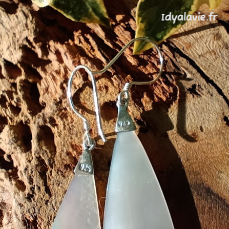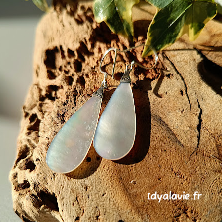 Ensemble de boucles délicates d'inspiration aquatique faites de nacre de coquillageen gouttes ornées de vagues de coeurs.
