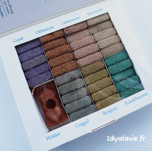 7 parfums distincts pour vous transporter selon votre humeur: Copal, Guggulu, Frankinsence (Boswellia Serrata), Benjoin, Labdanum, Patchouli, Oliban.
