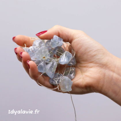 Une alliance pleine de charme et de délicatesse pour cette guirlande d'enchantement composée de cristaux naturels de Célestine (célestite) sur de petites leds créant une ambiance feutrée et douce.
