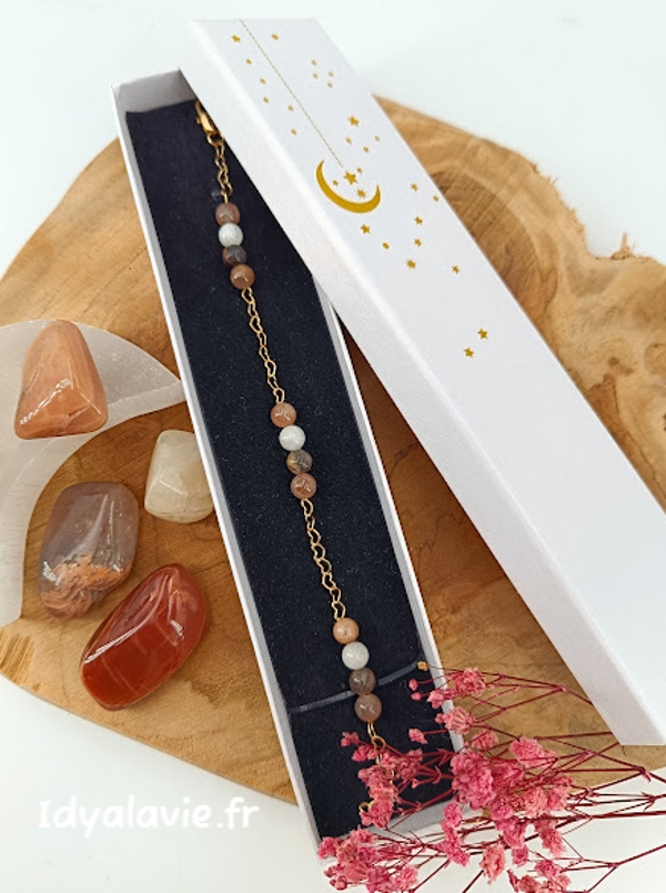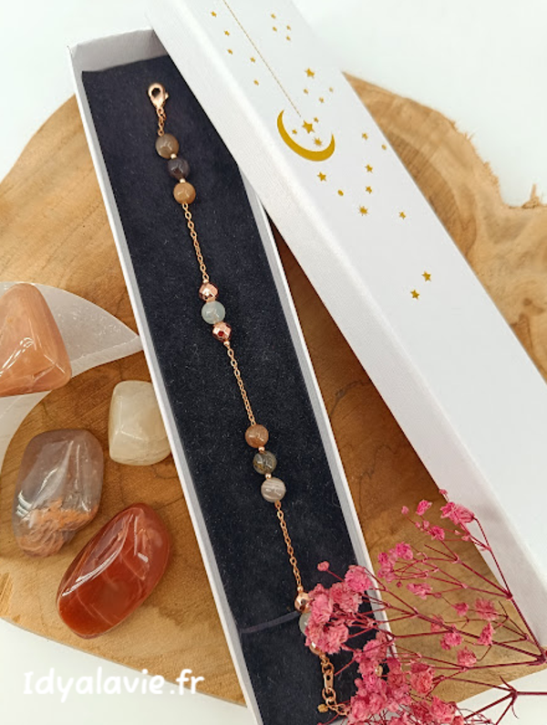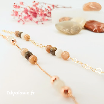 Composition de perles de pierres de lune multicolore de 6 mm sur chaînage en métal finition or 14K ou rose.