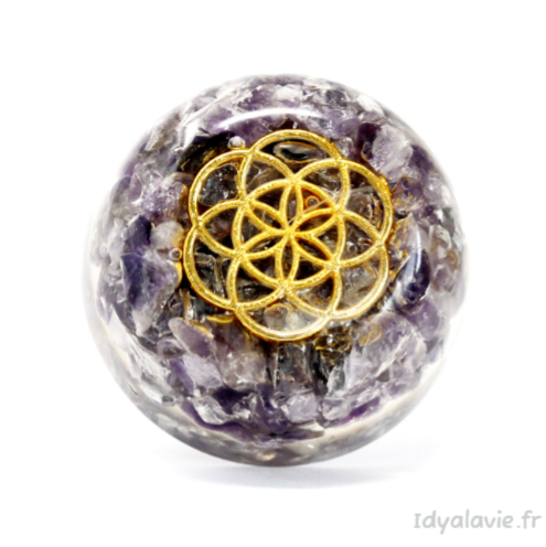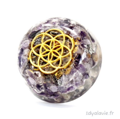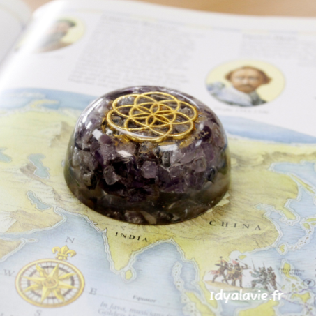 Presse papier à poser composé de pierres naturelles d'améthyste avec le motif de la Graine de Vie.