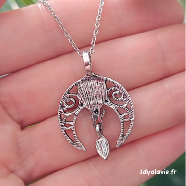 Pendentif bohème fantaisie tout en délicatesse et féminité aux formes d'un croissant de lune avec entrelacs surmonté de 2 gouttes en verre irisé aux reflets rappelant une pierre de labradorite. Métal finition argentée.