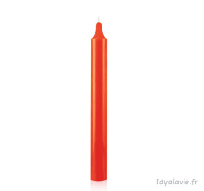 Bougie orange teintée dans la masse. 22 cm de long avec une durée de combustion d'environ 8 heures.