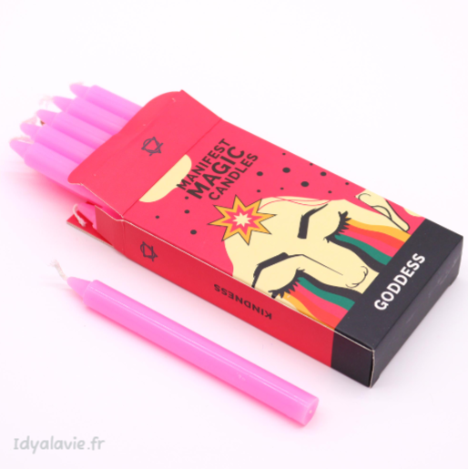 Laisser l'équilibre et l'enchantement opérer avec ces petites bougies roses Manifest Magiques. Boîte de 12 bougies en cire de soja. GENTILLESSE.
