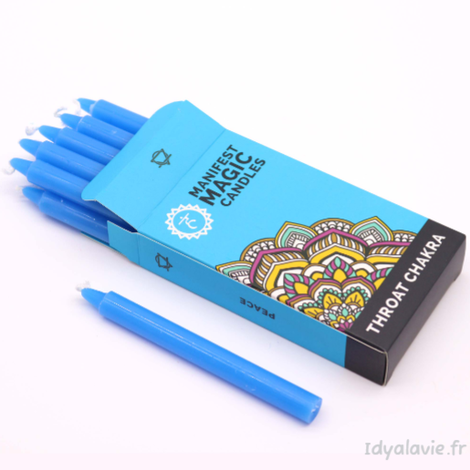 Laisser l'équilibre et l'enchantement opérer avec ces petites bougies blueues claires Manifest Magiques. Boîte de 12 bougies en cire de soja. PAIX.