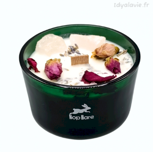 Fabriquées avec soin, ces bougies sont un voyage dans un monde où la cire de soja, les pierres et les fleurs séchées s'unissent dans une danse harmonieuse. Créée dans un contenant en verre vert foncé avec une mèche en bois rustique, chaque bougie magique Hop Hare est unique.