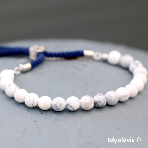 Un bracelet original et élégant qui se ferme grâce à un fermoir coulissant en métal finition argent 925 monté sur un cordon de couleur bleu marine qui vous permet d'ajuster le bracelet pour que la taille soit parfaite. Avec perle en pierres naturelles de 6 mm.