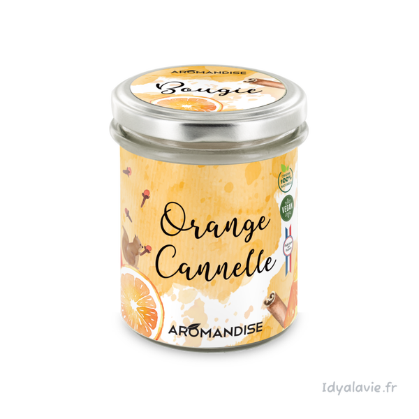 Cire de soja, mèche en coton, huiles essentielles chémotypées, 100% pures et naturelles : Orange douce Citrus aurantium*, Cannelle écorce Cinnamomum verum*, Clou de girofle Syzygium aromaticum*.