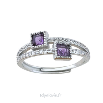 Bague en cuivre blanc avec 2 pierres carrées facettées d'améthyste.