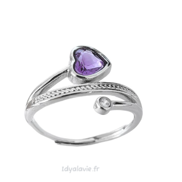 Bague en cuivre blanc avec 1 pierre en cœur facettée d'améthyste.