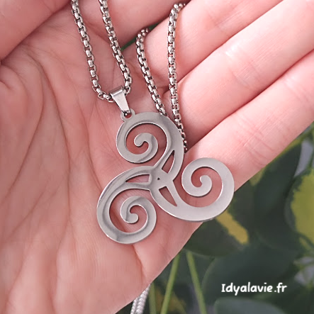 Pendentif en métal finition argentée brillante reprenant le motif aux origines celtiques du Triskel.