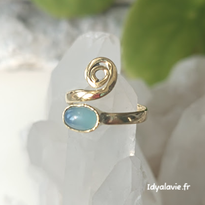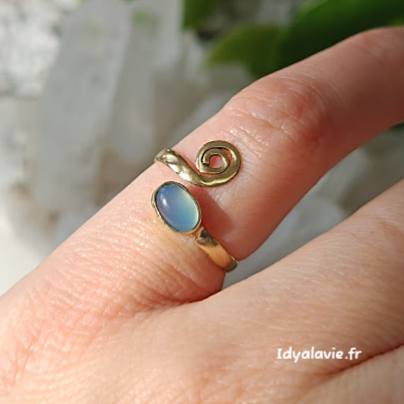 Cette bague en laiton finition doré est ornée d’une spirale délicate, symbole intemporel de croissance et d’énergie positive. Jumelle de la spirale, une véritable pierre d’onyx bleu, pour aider à surmonter les peurs et les inquiétudes.