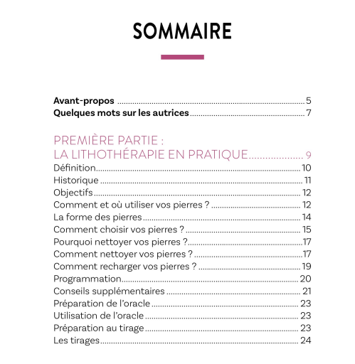 Grâce aux données minéralogiques ainsi qu’aux croyances et légendes racontées ici, entrez en contact avec les vingt-quatre pierres choisies pour vous. Écoutez leurs témoignages quant à leurs usages d’hier, et voyez comment elles peuvent vous accompagner aujourd’hui. Comment favoriser votre bien-être physique et émotionnel, ainsi que votre épanouissement spirituel grâce aux pierres ? Comment les choisir, les purifier et les recharger ? Vous trouverez au fil de ces pages de nombreux conseils et un oracle intuitif qui vous permettront de vivre l’expérience pleinement.