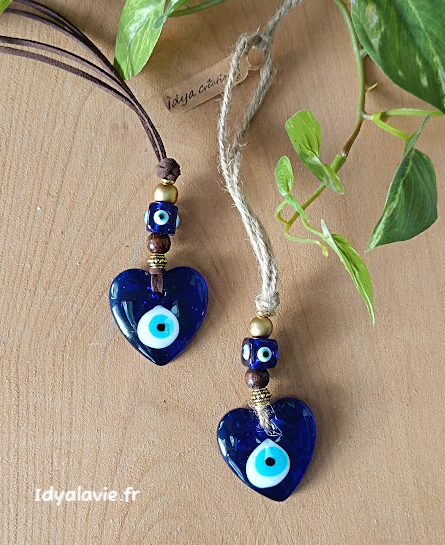 Une Création originale Idya Créations pour ces compositions d'amulettes Porte-Bonheur NAZAR BONCUK appelés aussi Mauvais Œil en forme de cœur.