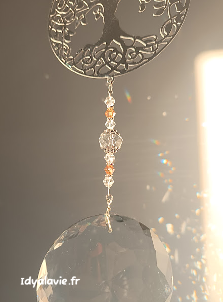 Le grand cristal en forme de disque en verre facetté (diamètre 7,5 cm) avec la complicité du soleil, saura refléter la lumière pour créer de sublimes arcs-en-ciel dans votre espace.