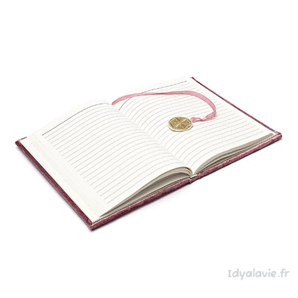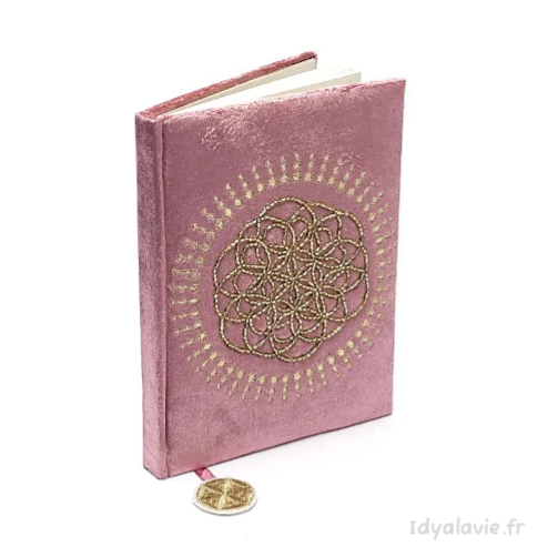 Carnet de notes en velours doux aux teintes vieux rose avec broderies délicates et perles décoratives au motif de la Fleur de Vie.