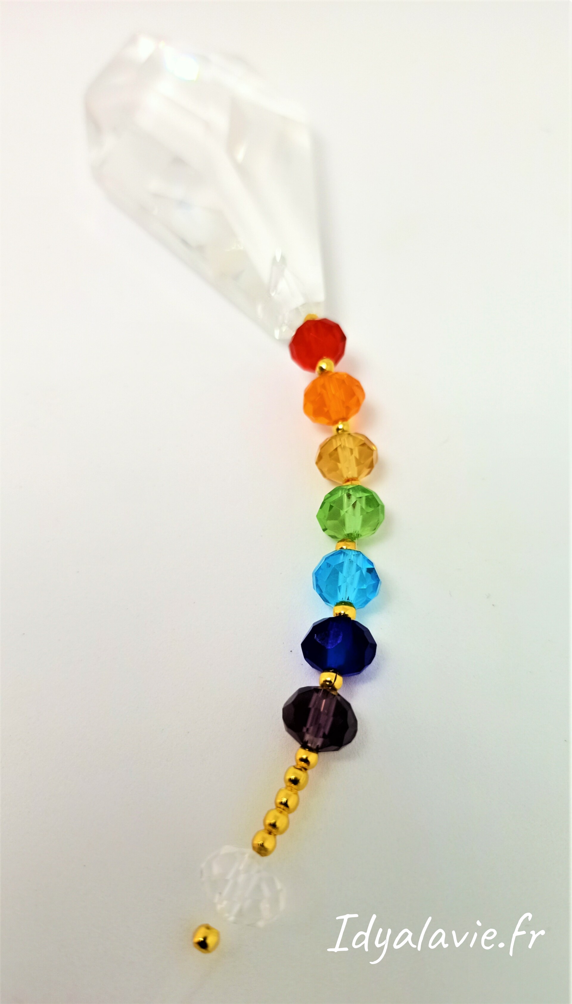 Assemblage sur fil nylon. Cristal flèche en verre facetté 8 cm. Perles de verres facettées aux couleurs des 7 chakras. Entretoise en perle métal finition dorée. Longueur env. 39 cm avec fil, décor 16 cm.