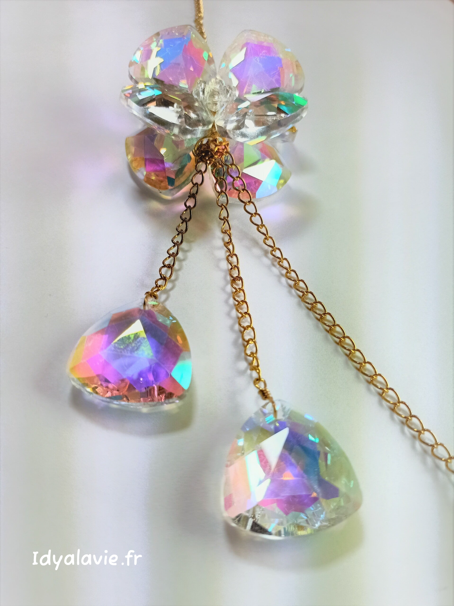 Assemblage sur chaînage métal finition dorée. Cristaux en verre facetté finition irisée. Longueur env. 34 cm. Photo contractuelle.