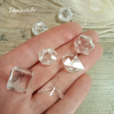 - Dodécaèdre (12 faces, 30 côtés) est lié à l'Ether (ou Prana, Qui), au Cosmos et à l'esprit Divin, intuition et spiritualité. Sa vibration favorise notre développement spirituel. Aide à développer notre écoute intérieure. Nous aide à relier notre âme spirituelle avec notre programme d'incanation en permettant de définir les priorités essentielles pour découvrir quelle est notre mission dans cette vie.