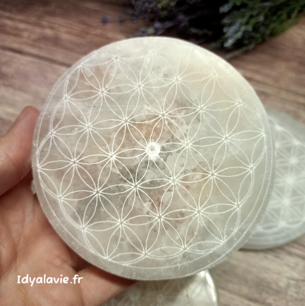 Porte-encens en sélénite gravé fleur de vie ***remisé***