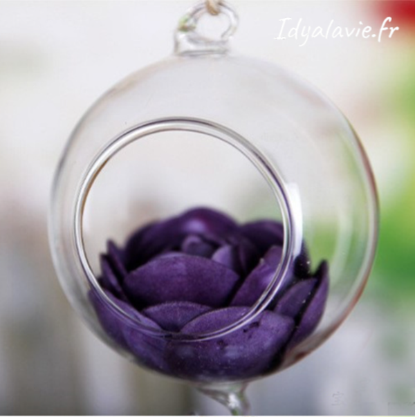 Petite boule en verre à suspendre servant de soliflore ou de terrarium combinable à d'autres suspentes.