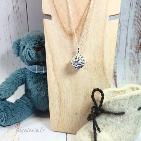 Modèle cage au motif de Lotus argentée avec brille nacrée violette. La cage peut-être ouverte pour y insérer un autre modèle de bille chantante de diamètre 18 mm ou un pompon ou autre bille poreuse pouvant servir de support d'aromathérapie post naissance (Huiles Essentielles ou autre parfum).