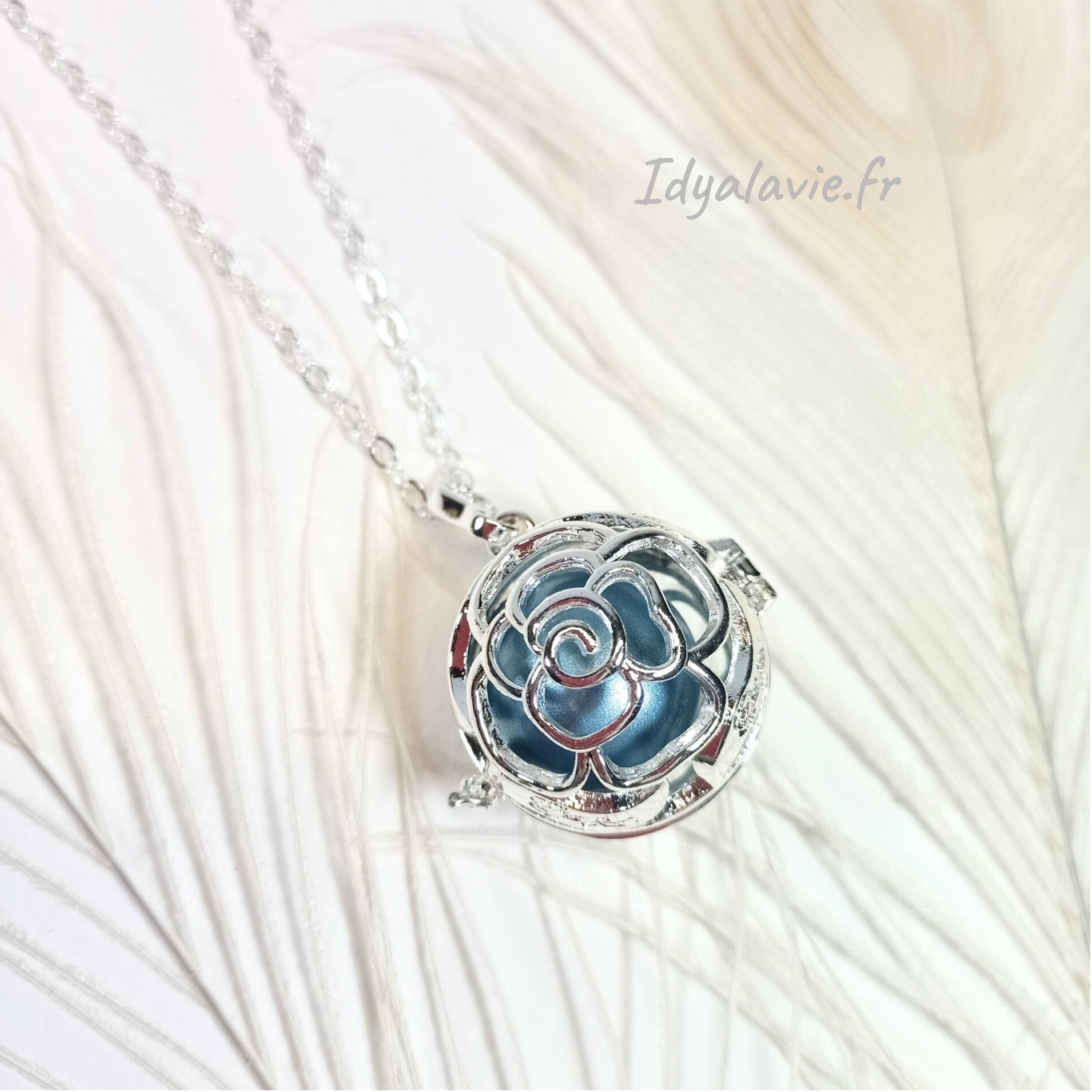 - UN BOLA cage au motif Floral argenté avec une bille carillon rose ou nacrée bleue au choix. La cage peut-être ouverte pour y insérer un autre modèle de bille chantante de diamètre 18 mm ou un pompon ou autre bille poreuse pouvant servir de support d'aromathérapie post naissance (Huiles Essentielles ou autre parfum).