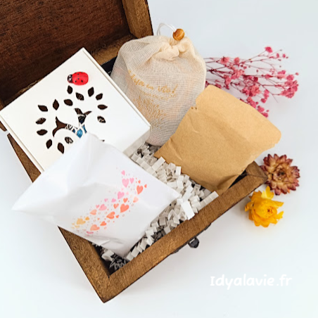 2 finitions de boîtes vous sont proposées: une boîte kraft ou un coffret luxe en bois de manguier sculpté au motif de l'arbre de vie.
