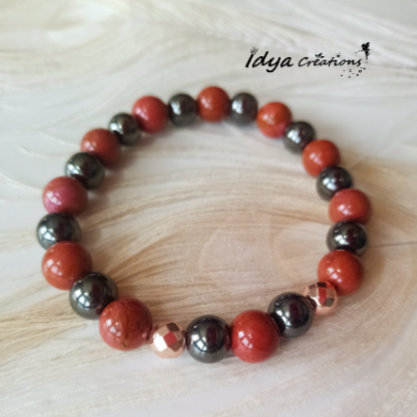 - UN BRACELET en perles naturelles d'hématite pour soutenir la circulation sanguine et de jaspe rouge pour donner de l'énergie face au quotidien. Une composition originale de Idya Créations pour ce bracelet extensible composé de pierres naturelles en perles de 8 mm. Apprêts métal finition cuivrée. Taille 18 cm (autre taille possible à la demande).