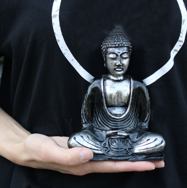 La pose Dhyana montre les deux mains sur les genoux avec le dos de la main droite sur la paume de la main gauche et les pouces se touchant, formant ainsi un triangle mystique.