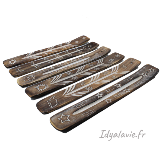 Porte-encens simple en bois de manguier blanchi avec motifs variés ciselés aléatoires.