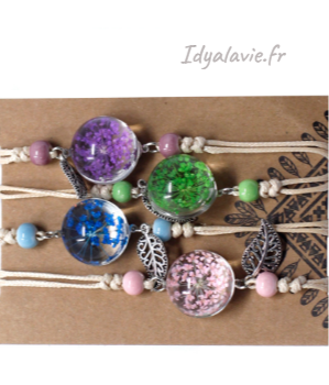 Cette gamme de bracelets en Fleurs pressées est fabriquée avec des fleurs véritables parfois teintées et pressées dans un morceau de verre.